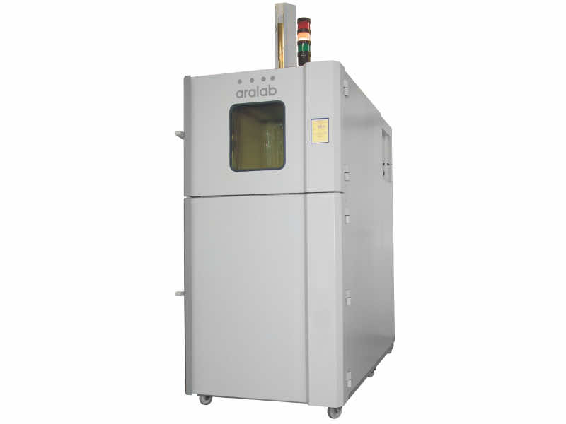 La cámara de choque térmico – fitoterm 150 CTE2 – está compuesta por dos cámaras independientes (frío / calor) en la misma estructura, permitiendo que los objetos de prueba estén expuestos a cambios de temperatura ultrarrápidos a través de un elevador interno que conduce los objetos entre las dos cámaras. La prueba de choque térmico se realiza transfiriendo entre dos cámaras internas – zona caliente y zona fría – mediante un elevador electromecánico, con una velocidad de transferencia inferior a 5 segundos. También cuenta con un sistema de desaceleración mecánica para eliminar vibraciones durante las pruebas. En la cámara de choque térmico FitoTerm 150 CTE2, la cámara superior soporta pruebas de calor hasta 200ºC, con calentamiento mediante resistencias eléctricas y circulación de aire. La cámara inferior es para pruebas en frío hasta -75ºC, con ventilación dinámica de 2m / s para homogeneización y uniformidad de temperatura.
